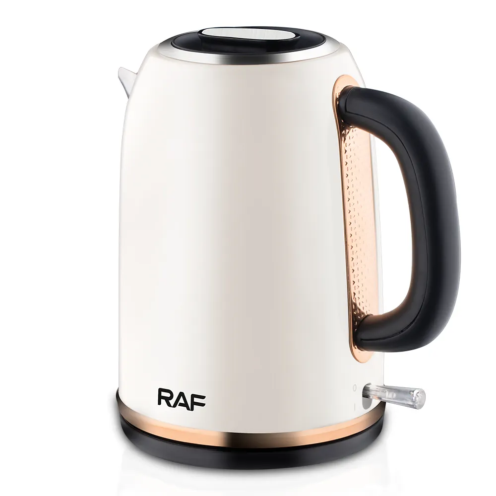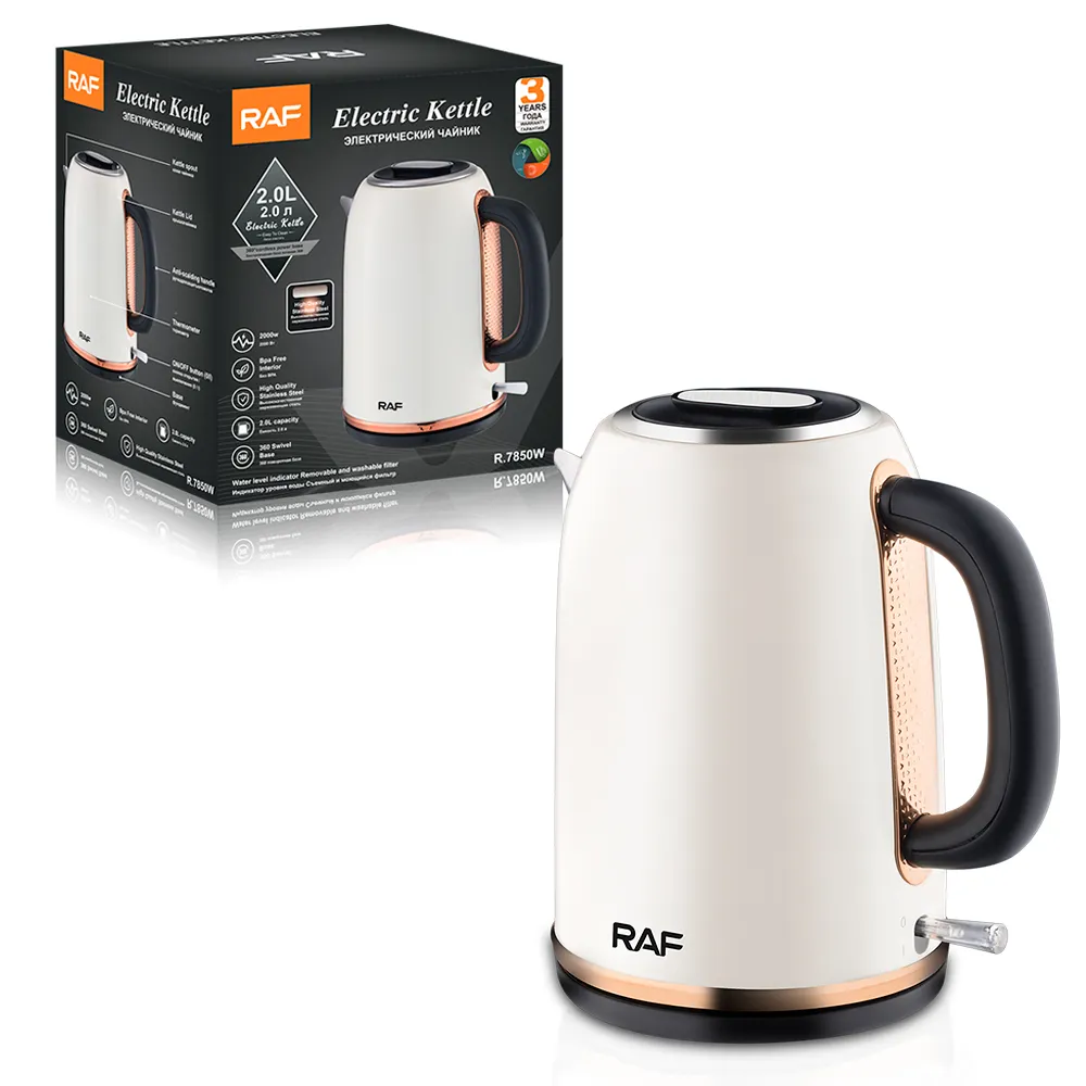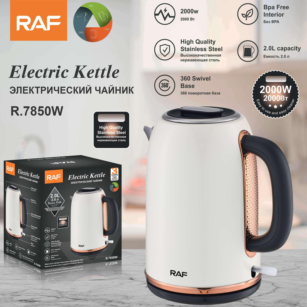 RAF električno kuhalo R.7850W donosi vam snagu od 2000W, kapacitet 2.0L, kvalitetan nehrđajući čelik i moderan dizajn u kombinaciji bijele boje i rose gold detalja.