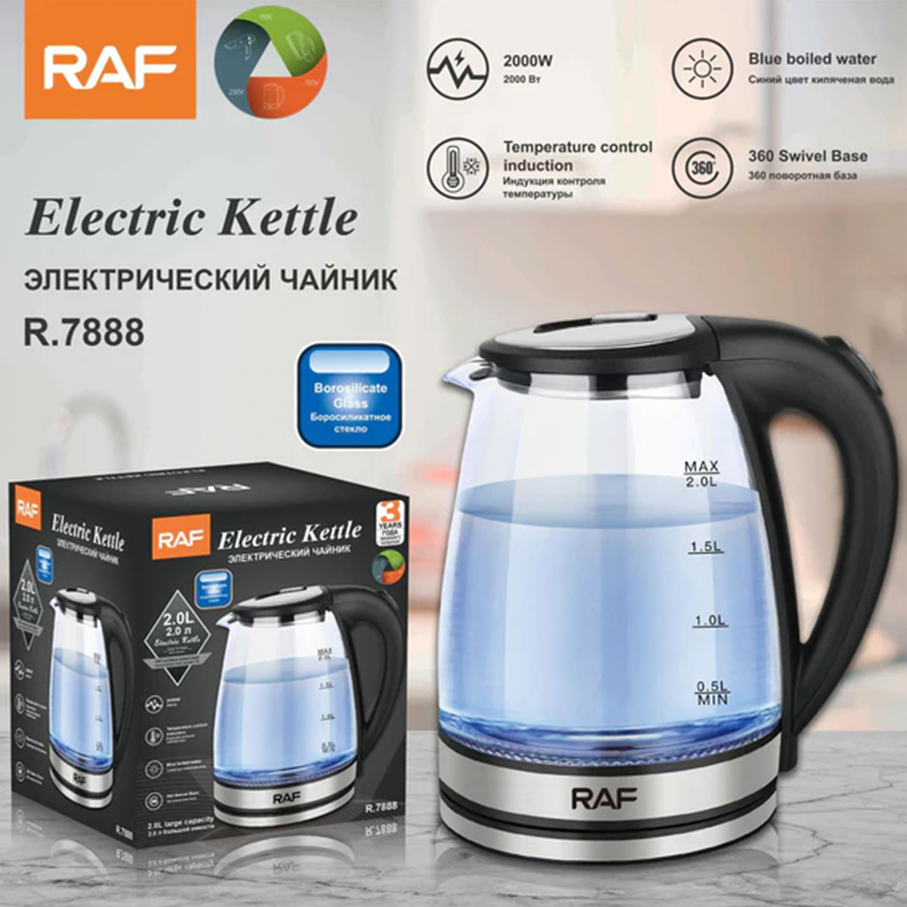 Električno kuhalo za vodu RAF R.7888, 2.0L, 2000W snage, borosilikatno staklo, LED svjetlo, automatska kontrola temperature i 360° baza.